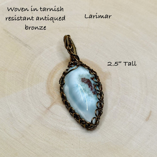 This pendant will have you feeling amazing. The antiqued bronze wire is tarnish resistant. The hugs this Larimar very nicely with all of the pretty woven loops. This wire wrap pendant is very elegant and unique. It would surely make a statement for any date night. It can be used for every day wear, and would make an amazing gift.
