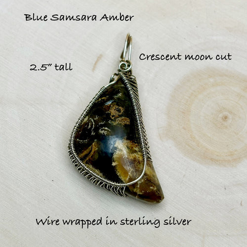 This Amber has been cut and polished into the shape of A crescent moon. It is hand woven in 925 sterling silver wire. This wire wrap pendant would make a great statement gift and is the perfect masculine or feminie piece.