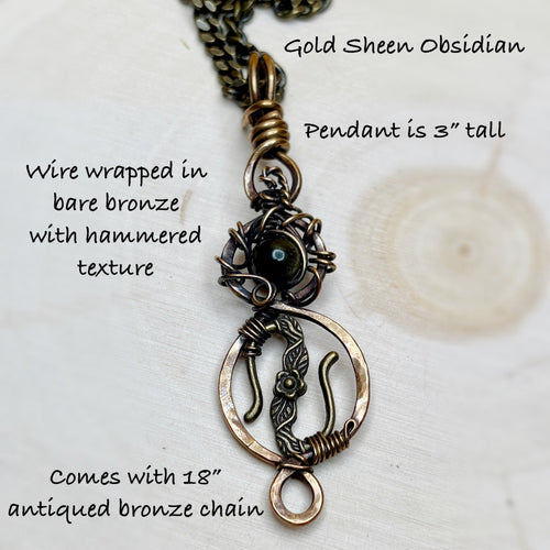 Crafted with precision, the necklace features a gorgeous gold sheen obsidian stone, known for its unique shimmer and striking appearance. Sourced from Mexico, this natural stone is woven into a beautifully designed using high-quality jewelers bronze 12-gauge wire.