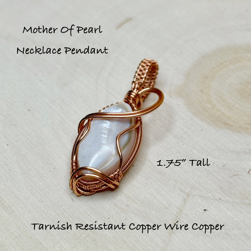Mother of pearl is a natural, organic-inorganic composite material made of calcium carbonate and conchiolin, a protein that gives it a pearly sheen. Beautiful silky white in color. Wire woven asymmetrically in tarnish resistant copper wire. Unique swoops are added to the woven bezel for the added elegance.
