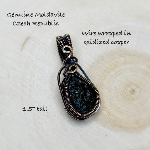 This beautiful genuine Moldavite tektite is woven intricately in oxidized copper wire. Oxidized copper is wire that is tarnish for a unique look. This wire wrap pendant is one of a kind and cannot be duplicated. Moldavite is a beautiful natural green high silica glass that formed with meteor impact in the Czech Republic. It is the only place it can be found.