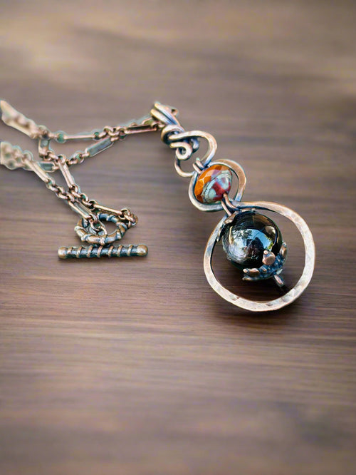 This piece is formed used 16 gauge bare copper wire. It has been hammered it to give it texture and tarnished it to give it definition. The hypersthene spins at the biggest halo of the pendant. The orange Saturn bead is Czech glass made in the Czech Republic. This wire wrap is very elegant and hangs on a 20" copper chain that has a toggle closure.