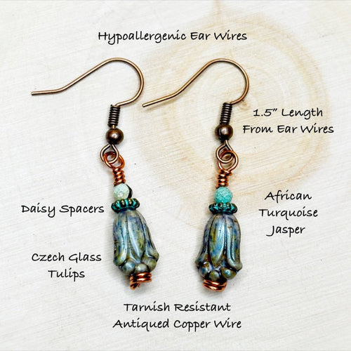 Hanging on the antiqued copper hypoallergenic ear wires are beautiful beads that really complement each other in style and look. The turquoise faceted stone beads are a gorgeous light blue and glisten in the sun. These Turquoise beads are resting upon patina bronze daisy spacers. The focal of these dangle earrings are Czech glass Tulip beads that features Picasso greens, and blues. These gorgeous beads are on hand knotted head pins made with tarnish resistant antiqued copper wire.