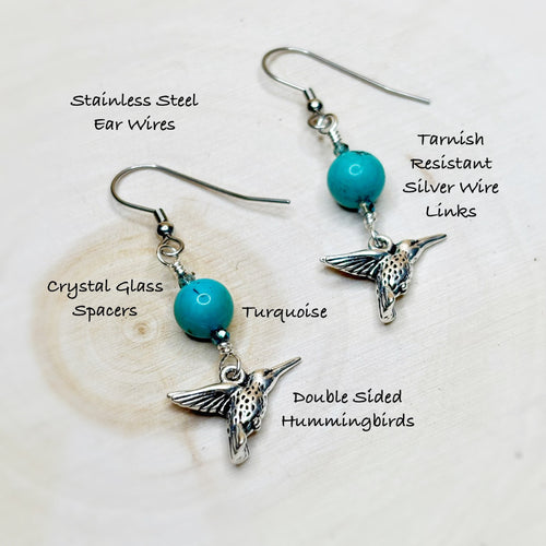 Hanging on the stainless steel ear wires are beautiful turquoise stone beads that are a beautiful sky blue framed with sparkly crystal glass spacers. The charm dangles at the bottom are dainty hummingbirds.The hand wire wrapped head pins are tarnish resistant silver plated copper.