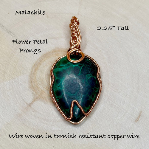 This wire wrap pendant is woven in tarnish resistant copper wire. It will last a long time with good love and care. This pendant will make anyone who wears it feel unique with a statement piece like this. The prong settings are meant to mimic leaves or flower petals. Something new and interesting.