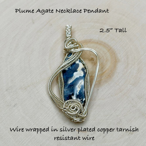 Plume agate is so beautiful. It is found all over the United States. This piece in particular has blues and whites. It might make you think of a sunny day with a bright blue sky and clouds. This stone is wire wrapped in silver plated copper that is tarnish resistant.