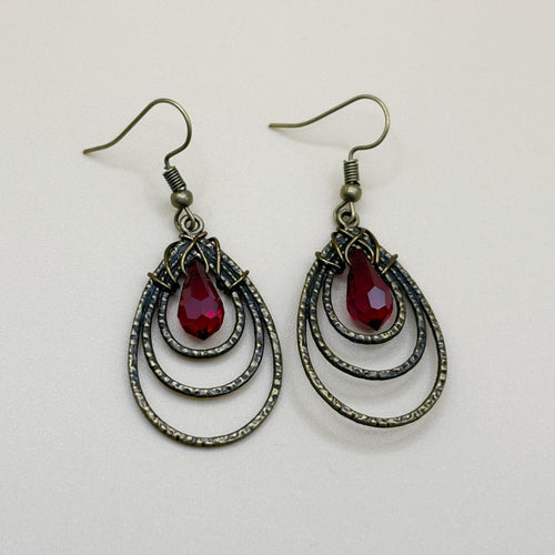 These lovely earrings are stunning. The ear wires are hypoallergenic antiqued bronze. Hanging off the ear wires and matching drop focals with vintage ruby red Swarovski crystal beads wire wrapped to them. The wire is tarnish resistant antiqued bronze to match the embellishments of the design.