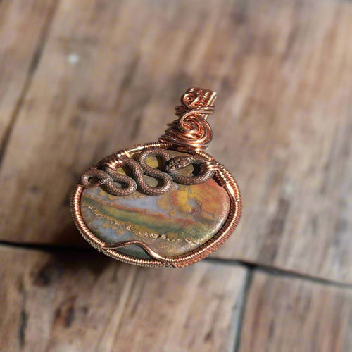 Beautiful matte textured Arizona agate coin wire wrapped in a beautiful tarnish resistant copper weaved framed. Attached to the wire woven is a pewter based copper snake to complement this piece. The snake is hanging out in the dessert, as this stone might remind you of the dessert. This pendant is just all around awesome, perfect for men and women.