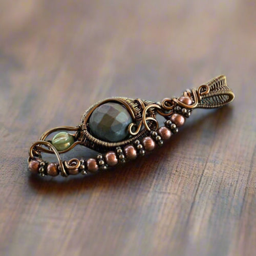 This pendant is made using tarnish resistant vintage bronze wire. The wire is woven intricately through and around the focal. The focal is a faceted cherry creek jasper from Arizona. It shows beautiful earth tones colors of browns and green. The green dangle under the jasper is a Czech glass bead.